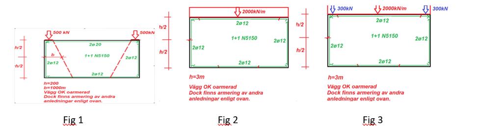 Illustrerar med tre exempel enligt nedan, där det ligger armering i väggen av andra anledningar än den med hänsyn till bärförmåga för väggen, exempelvis för ingjutningsgods eller för att förhindra krymp och krypsprickor. Överst ligger dock en armering för att förhindra hörnspjälkning på grund av punktlasten.
