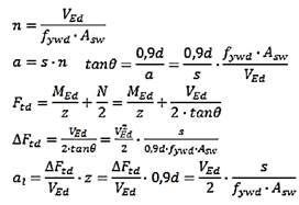 Kan jag då använda VRd,s =ASW*fywd(cot θ + cot α)sin α, som ger för 16 mm armering med avstånd 250 mm = 806 mm2 x 435 x (1.5+1) x 0,7 =613 kN (med cot θ =1.5 och 45 grader och ett lager). Eller ska jag använda VRd,s =ASW x fywd x sin α = 806 x 435 = 350 kN (samma förutsättningar som ovan)?